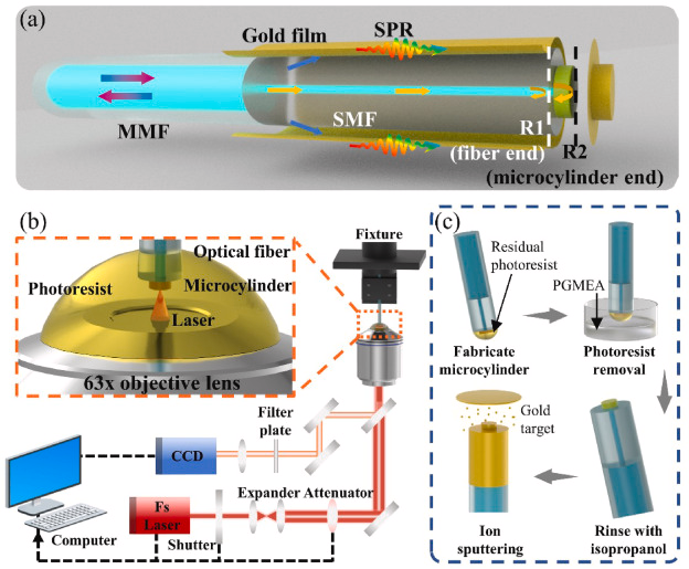 相较于传统质谱、色谱等检测方法,光纤表面等离子体共振(SPR)传感器具备实时监测、生物相容性好、免标记、灵敏度高等优势,被认为是液态环境中金属离子检测的最具潜力的技术之一。然而,受光纤热光学效应的影响,温度波动易导致检测信号漂移,制约其实际应用。针对该问题,研究团队利用双光子聚合3D打印技术,在光纤端面成功制备出微米级法布里-珀罗干涉仪结构,作为温度传感通道,实现了对SPR传感器的集成化温度补偿。该传感器由5 mm单模光纤(SMF)与多模光纤(MMF)熔接而成,并借助双光子聚合技术在SMF端面打印出直径80 μm、高10μm的圆柱结构。该微柱与光纤端面构成法布里-珀罗干涉仪,其自由光谱范围可通过微柱高度灵活调控,从而匹配SPR传感器的检测波段。研究同时合成了一种对Pb²⁺具有高亲和性的席夫碱材料,将其与壳聚糖复合后修饰于传感器表面,赋予传感器优异的Pb²⁺识别能力。实验表明,该传感器对Pb²⁺表现出卓越的检测性能:灵敏度达–41.55 nm/μM,检测限低至7.05 nM,并具备良好的选择性、稳定性和重复性。所集成的法布里-珀罗干涉仪结构对Pb²⁺结合过程无响应,仅敏感于温度变化,从而实现了精准的温度补偿。