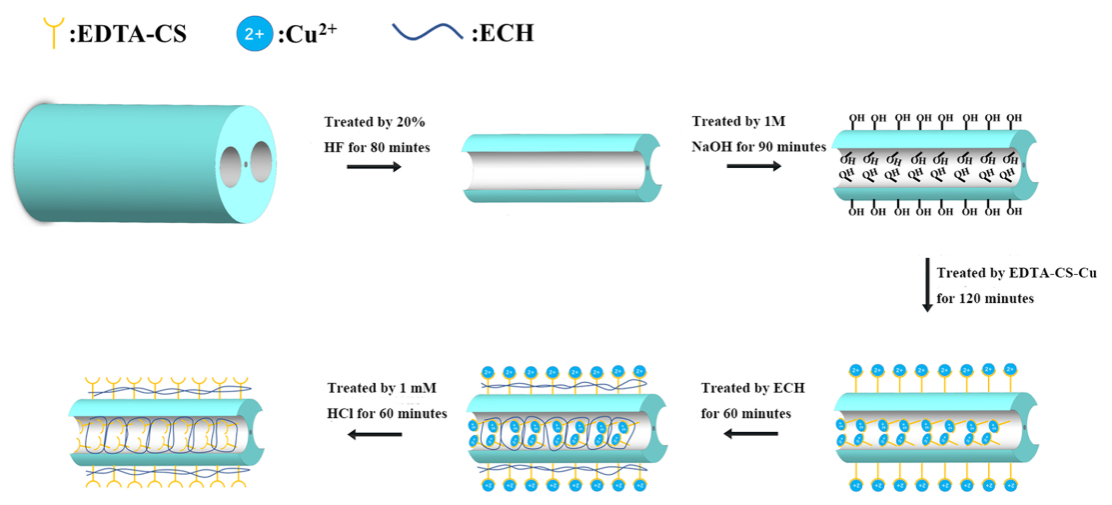 相较于传统质谱、色谱等检测方法,光纤Sagnac干涉传感器具备实时监测、灵敏度高、抗电磁干扰等优势,被认为是液态环境中金属离子检测的最具潜力的技术之一。然而,受光纤热光学效应的影响,温度波动容易导致Sagnac干涉谷的偏移,导致检测结果的不准确。针对这一问题,研究团队采用双孔光纤作为传感单元,使用氢氟酸去除双孔光纤的外包层,从而将双孔区域与外界相连;合成并表征了乙二胺四乙酸接枝壳聚糖衍生物(EDTA-CS),并使用氢键键合的方式将其与氢氟酸腐蚀的双孔光纤结合,并完成Cu2+离子印记处理,以增强其对于Cu2+的选择性螯合能力。实验结果表明,该传感器对于Cu2+表现出卓越的检测性能,在10-15-10-6 M的铜离子浓度范围内,其最大灵敏度达到12.08×109 nm/μM,平均灵敏度达到129.96 nm/μM,并表现出良好的选择性、稳定性和重复性。所用双孔光纤的光热效应不明显,因此该传感器免疫于温度干扰,从而实现精准检测铜离子。