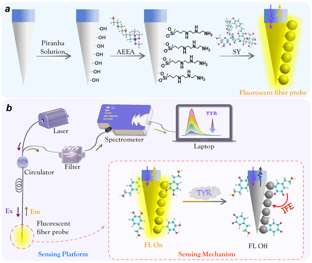 荧光光纤传感器通过将荧光材料与光纤传感技术相融合,为生物分析提供便携、高效的新路径。然而,传统荧光光纤传感层的制备主要采用两种方式:一是将荧光材料嵌入聚合物后涂覆于光纤表面;二是先将荧光材料与光纤预功能化,再通过化学键合固定。前者所得传感层稳定性差、存储条件苛刻、界面反应受限;化学键合法虽能提高稳定性,但制备流程复杂。针对上述问题,研究团队提出在光纤锥表面原位制备基于荧光硅量子点(SiQDs)的传感层,再结合TYR诱导的荧光猝灭效应,开发荧光光纤TYR传感器。具体流程为:先对光纤锥表面进行硅烷化处理,再以天然红花黄色素为还原剂,通过原位氧化还原反应生成黄色荧光SiQDs,实现探头的一步制备。利用TYR催化多巴胺转化为多巴胺醌及其对SiQDs的荧光猝灭效应,制备TYR传感器。该传感器对TYR检测限低至0.025 U/mL,线性检测范围为0.03~1.0 U/mL,并成功用于实际血清样本的分析。该传感器制备简便、稳定性高、灵敏便携且成本低,为生物酶活性的在线监测提供了可行方案。本研究不仅提出了一种构建高性能光纤传感器的实用策略,也拓展了荧光光纤技术在临床与生物领域的应用,丰富了团队在生物光电感知方向的技术储备,并为我校光学工程学科的创新发展注入新动力。