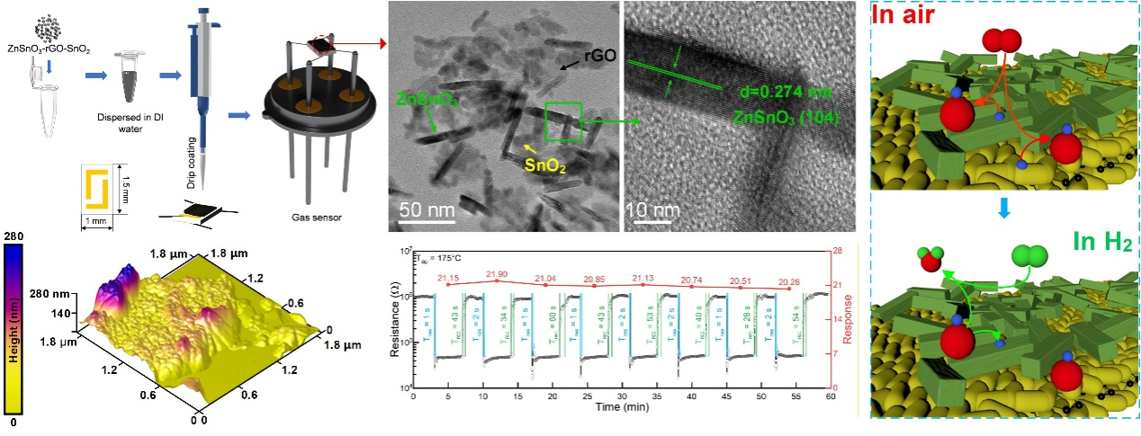 氢能因其零碳排放特性,被认为是未来能源体系的重要组成部分。然而,由于氢气具有极低的点火能和宽广的可燃范围,一旦泄漏便可能带来严重的安全隐患。因此,如何在极低浓度下及时、准确地监测氢气,是氢能产业普及过程中亟待突破的关键技术。为解决这一难题,光谱与量子气体检测研究所通过一步共沉淀法构建了由ZnSnO3纳米棒、SnO2纳米颗粒和还原氧化石墨烯(rGO)组成的三元复合结构,通过材料界面工程显著提升了传感器的灵敏度与响应速度。