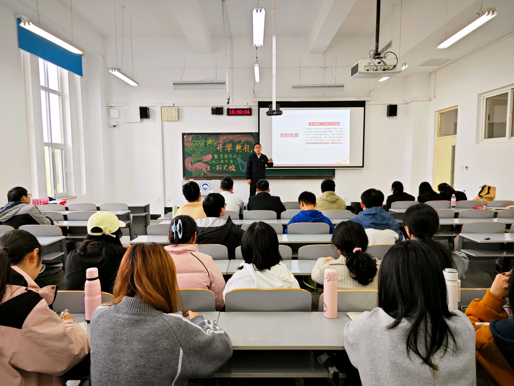 第一次党课,赵强以“坚持党的全面领导,建设中国式现代化”为主题,围绕产业升级、新能源战略、智能制造三大领域,结合党的先进理论,生动讲述了中国共产党带领全体人民建设现代化国家的奋斗历程,阐明了党的初心使命与中国特色社会主义制度的优越性。通过分析钢铁行业升级、新能源产业发展、传统制造业与AI融合等案例,引导同学们深刻领悟中国式现代化的本质要求,把握新时代新征程党的使命任务,鼓励大家将个人理想追求融入党和国家事业,为实现中华民族伟大复兴贡献青春力量。