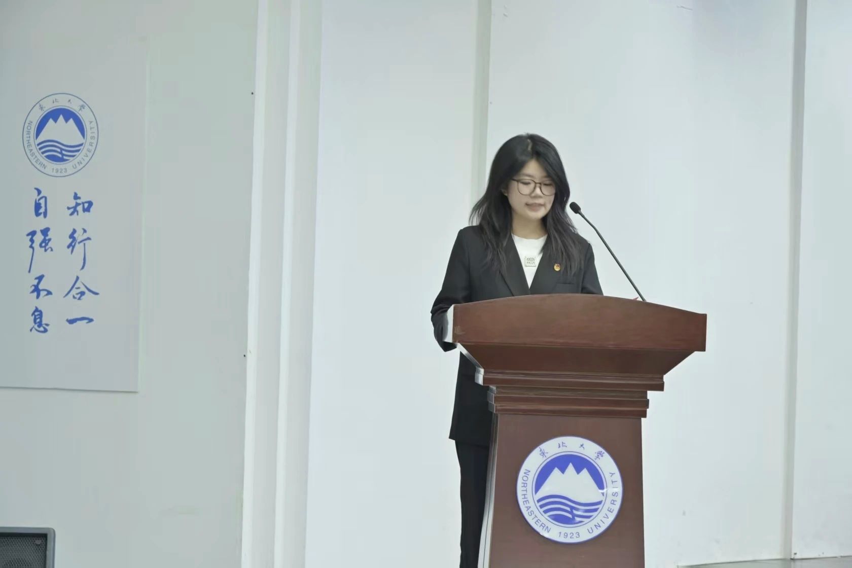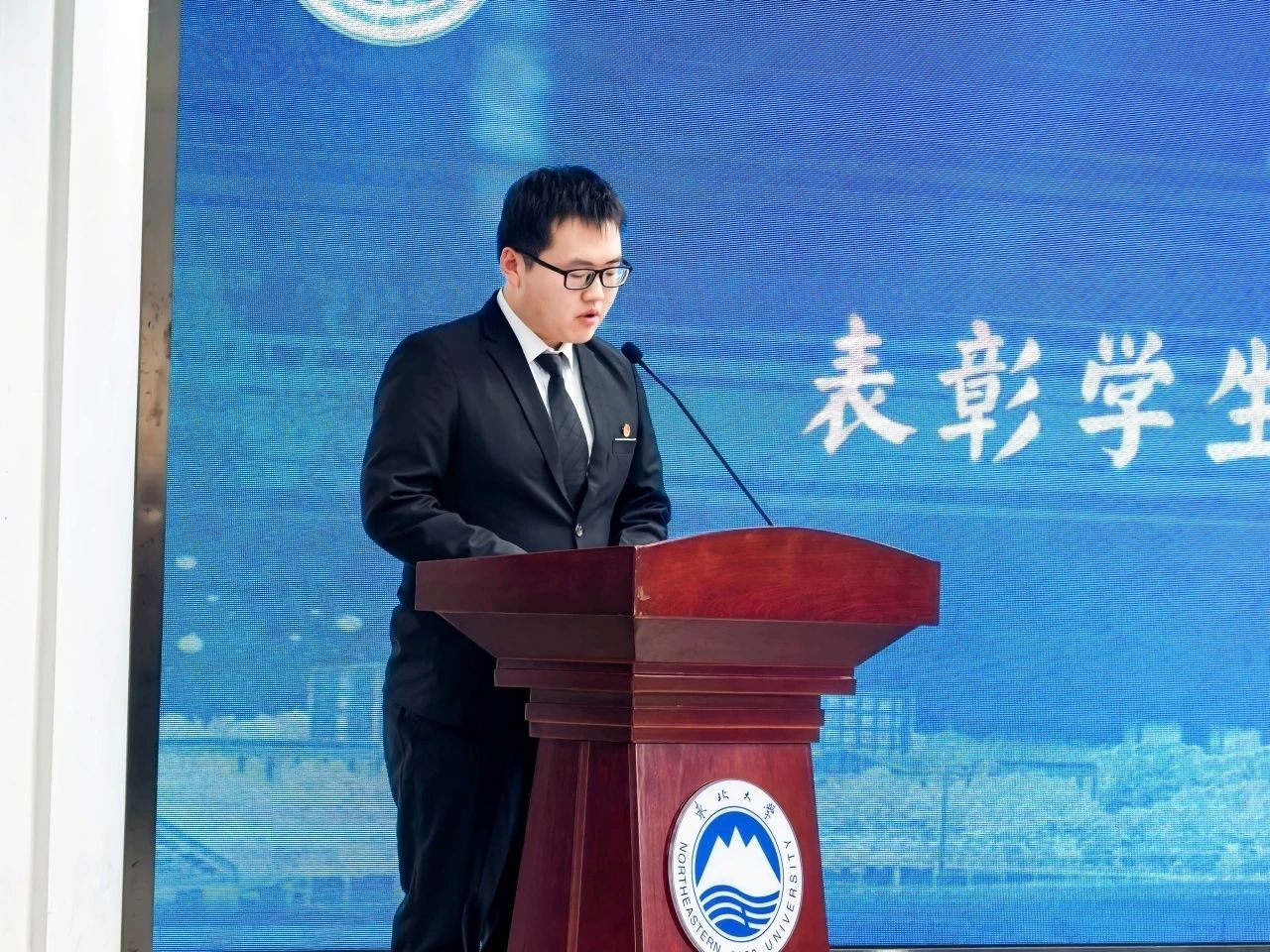 在庄严的国歌声中,大会正式开始。校学生会主席团成员张戬宣读东北大学秦皇岛分校学生会贺信。