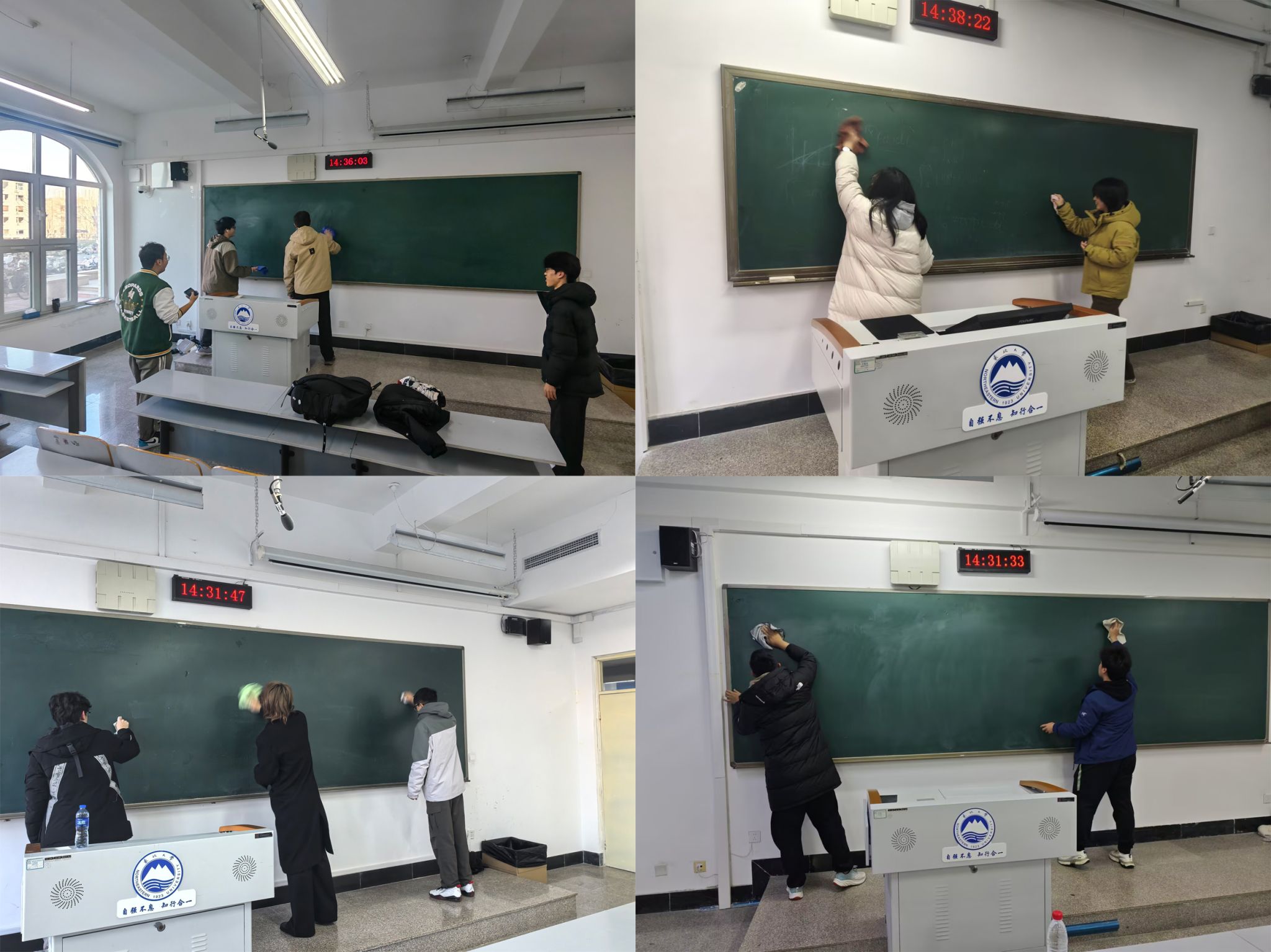 12月17日,我院组织开展“一扫一拾间,文明自彰显”校园卫生清洁活动。一百名学生志愿者走进工学馆教室和南校区广场,将黑板擦拭干净,自行车摆放整齐,做好校园卫生维护工作。