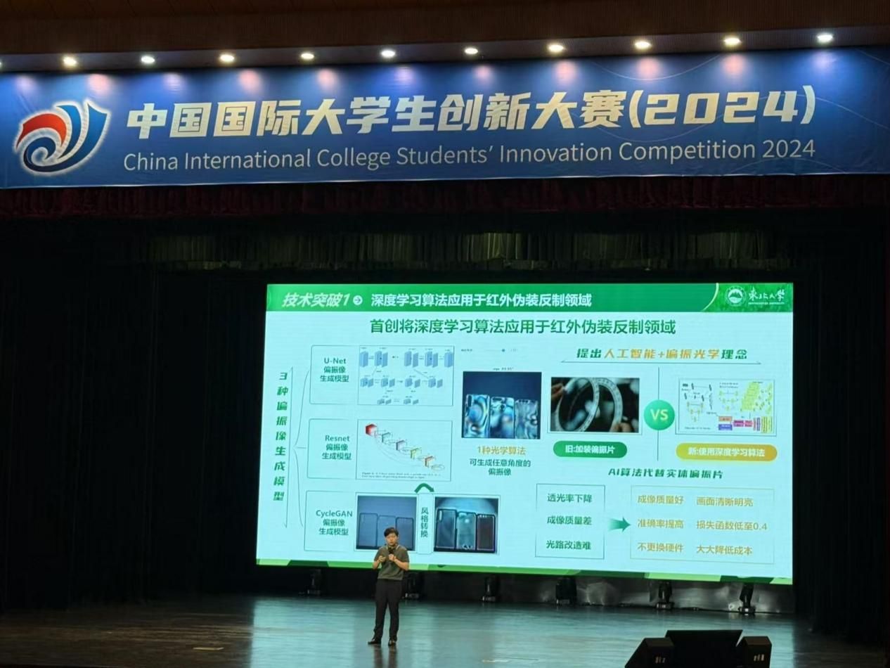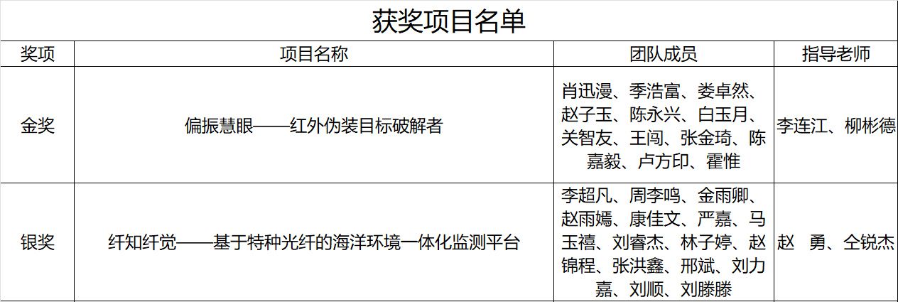 学院持续做好参赛项目的组织管理,围绕项目技术逻辑、科技理论创新、内容整体展示开展培训,对进入国赛现场赛的团队进行全面支持,做好针对性的指导。经过国赛网络评审、现场赛答辩,我院参赛作品《偏振慧眼——红外伪装目标破解者》从300个项目中脱颖而出,并以小组赛第一名的成绩晋级现场排位赛,最终取得全国第八名的骄人战绩。参赛作品《纤知纤觉——基于特种光纤的海洋环境一体化监测平台》获得银奖。