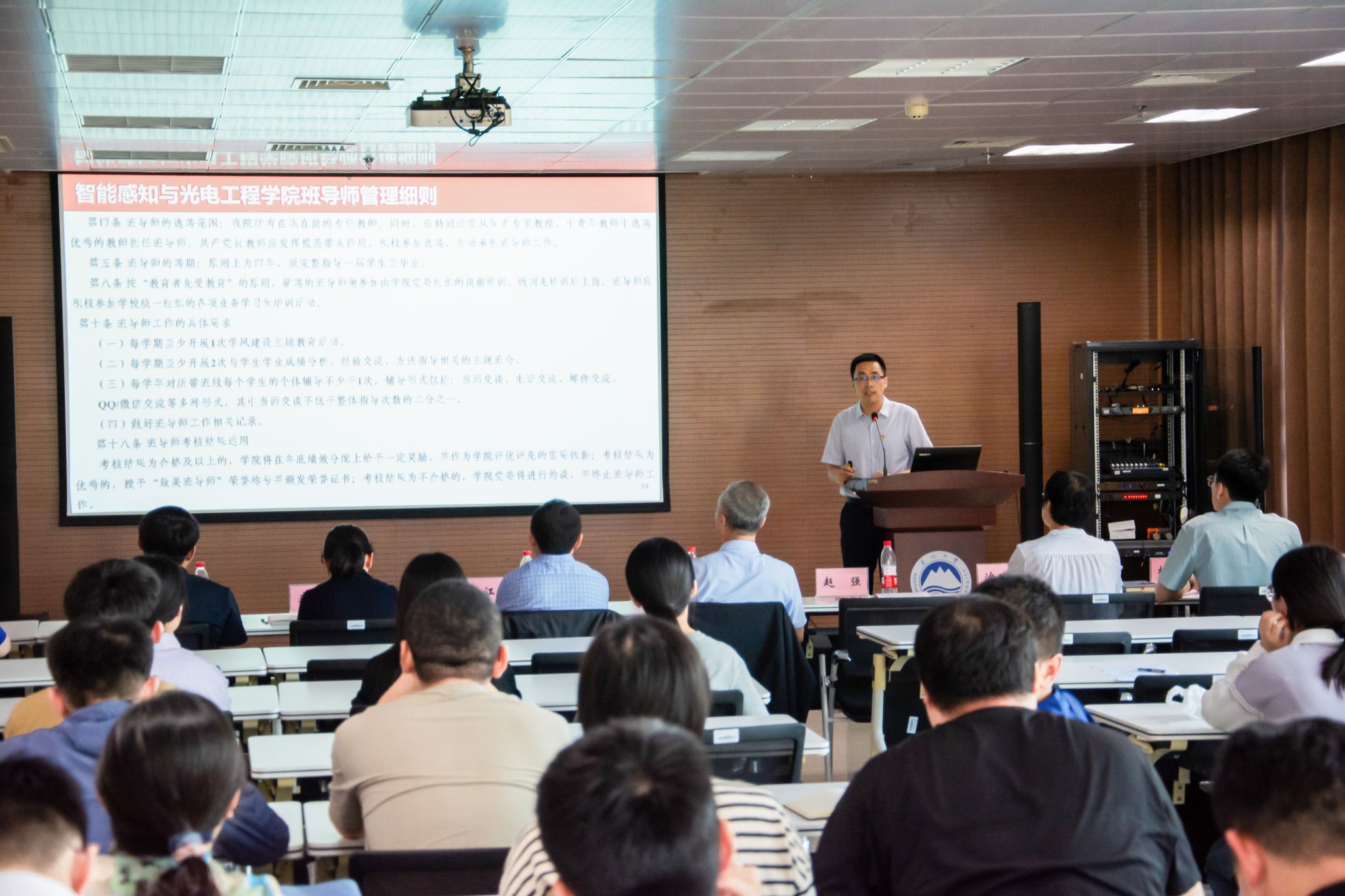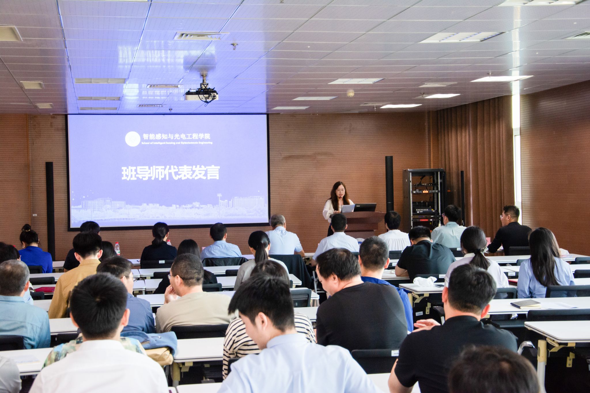 冯亭宣读2025年智能感知与光电工程学院班导师聘任名单。李莉柯、李国栋、王子宁、王艳琼、林子婷、刘莹轩、李连江、李翔、朱洪民等九位教师被聘任为仪器类2501班至2507班、智能感知2501班和2502班班导师。