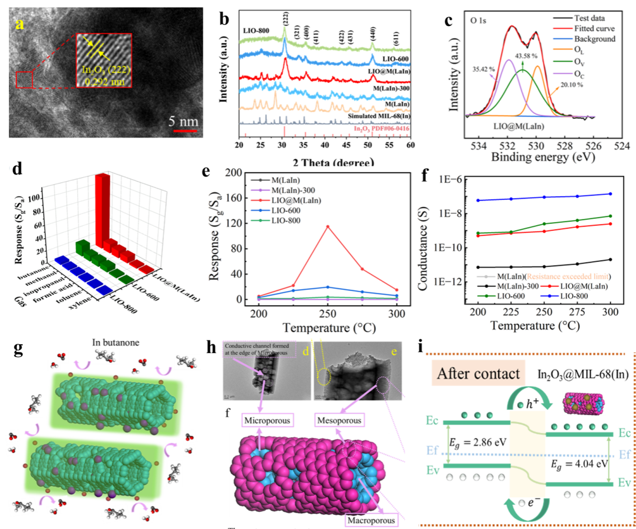 图1(a)LIO@M的TEM图像和HRTEM图像,(b)模拟的 MIL-68、M、M-300、LIO@M、LIO-600和LIO-800的X射线衍射图谱,(c)LIO@M的O 1s 特征峰,(d)传感器在250°C对100 ppm不同气体的响应,(e)传感器在不同工作温度下对100 ppm丁酮的响应,(f)传感器在不同温度下的导电性,(g)LIO@M上丁酮气体传感机制的示意图,(h)包含大孔、中孔和微孔的三阶段孔隙结构,(i)In2O3和MIL-68形成的异质结能带的示意图。